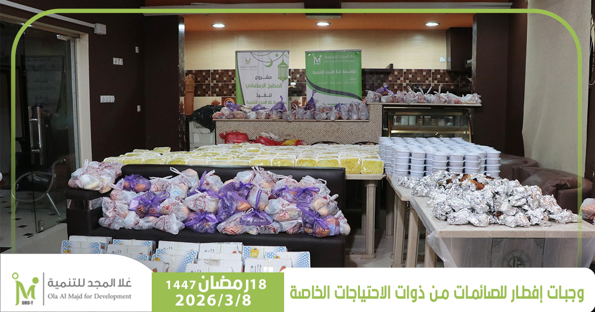 في إطار جهودها الإنسانية خلال شهر رمضان المبارك، نفّذت مؤسسة علا المجد للتنمية OMD_Y مشروع المطبخ الرمضاني، ضمن برامجها الهادفة إلى تعزيز التكافل الاجتماعي ودعم الفئات الأكثر احتياجًا خصوصًا في شهر رمضان المبارك.